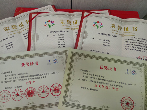 2013年,杨彩琴和王静指导、任天坤(女,1992.05生,2010级药学专业)作为主要负责人、张宇睿(男,1991.11生,2010级药学专业)和刘晓亚(女,1992.03生,2010级药学专业)为主要参与者的大学生实验创新论文《齐墩果酸共晶的研制及热力学研究》获“挑战杯”2013年河北省大学生课外学术科技作品竞赛特等奖。并被推选参加同年的全国竞赛,获得第十三届全国大学生课外学术科技作品竞赛中二等奖,并获得交叉创新奖二等奖。这是性爱影片 历届“挑战杯”参赛以来的最好成绩,是全国“二等奖”的突破。杨彩琴和王静老师被评为河北省“大创”优秀指导教师。王静老师还应邀给全校学生做了题为“揭开“创新”的神秘面纱---指导“大学生创新性实验计划”有感”的报告。第二年,同样的作品又参加了第六届“全国大学生药苑论坛”竞赛,获得了创新成果二等奖和优秀论文奖,也是药苑论坛参赛史上的最好成绩。