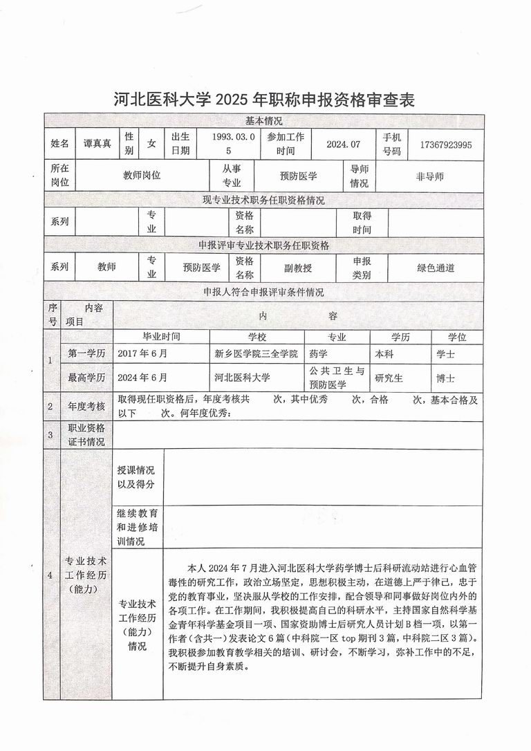 专业技术职务任职资格情况一览表-谭真真