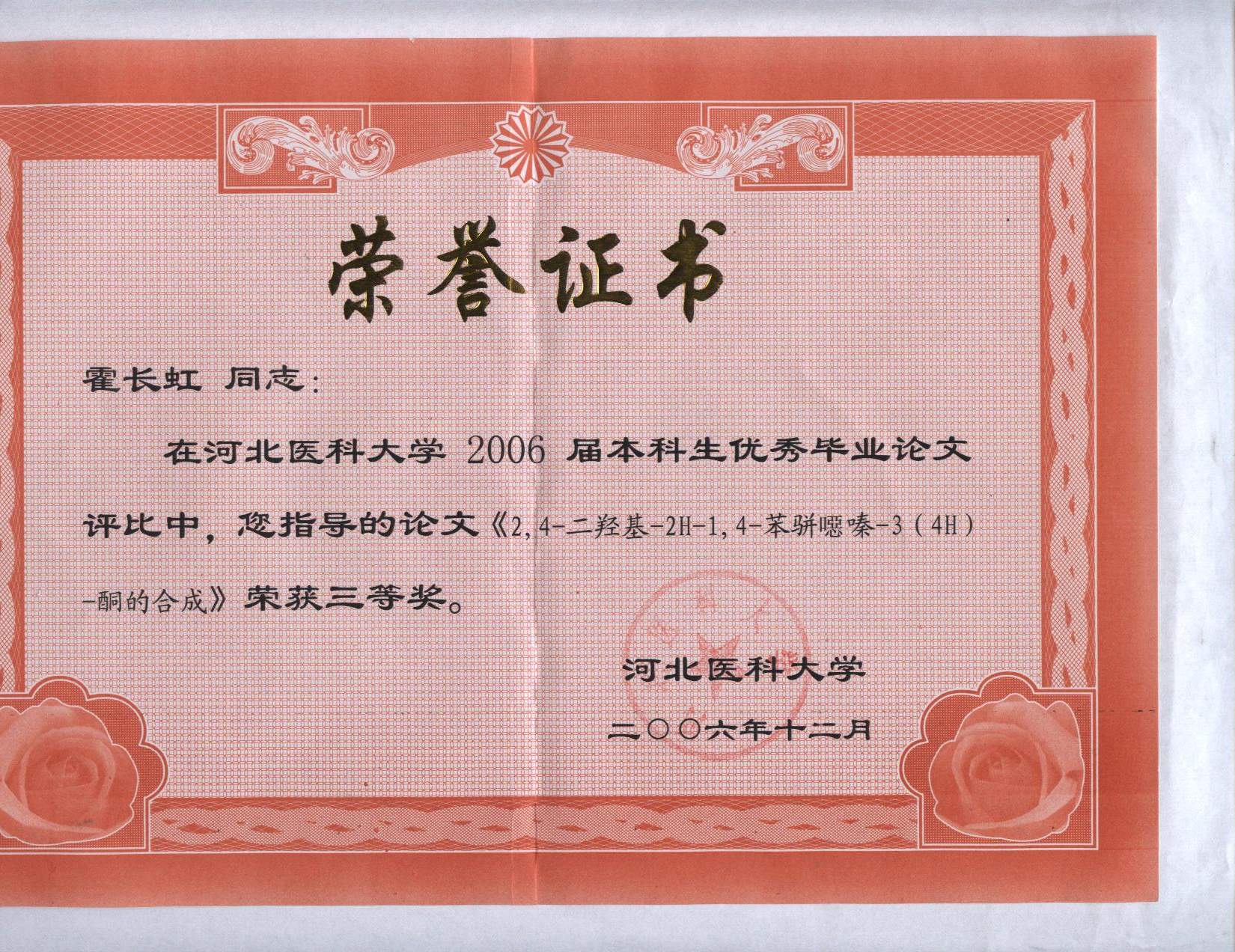 2006-12霍长虹指导的本科毕业生论文获校三等奖
