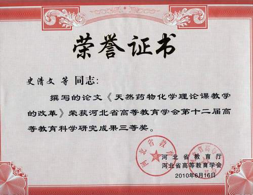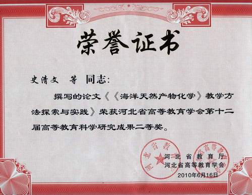 在第12届河北省高等教育学会高等教育教育科学研究成果评选中,我室教师撰写的论文《海洋天然产物化学教学方法探索与实践》(作者:史清文、霍长虹、李力更、张??丽)、《天然药物化学理论课教学的改革》(作者:史清文、李力更、霍长虹、张??丽、李作平)分获二、三等奖。
