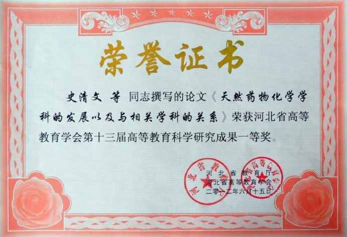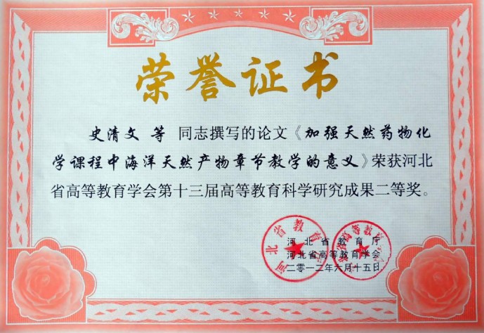 由我室史清文、李力更、霍长虹、张??丽和王于方撰写的《天然药物化学学科的发展以及与相关学科的关系》(中草药, 2011, 42(8): 1457)《加强天然药物化学课程中海洋天然产物章节教学的意义(药学教育, 2011, 27 (4): 23)两篇教学改革论文,分别荣获河北省高等教育学会第十三届高等教育科学研究成果一等奖和二等奖