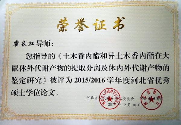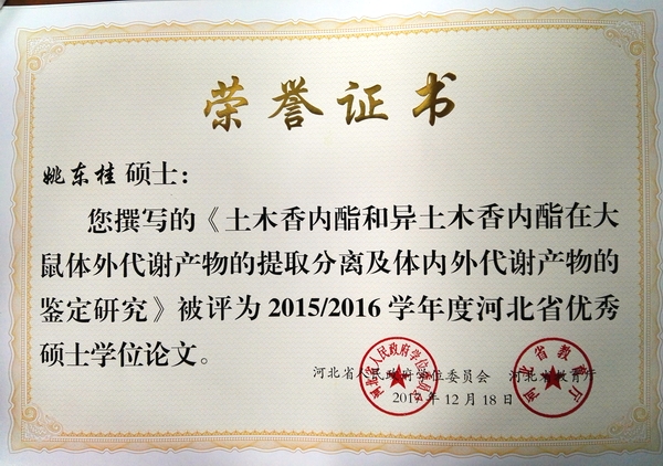 由我室 霍长虹 教授指导的2013级硕士研究生姚东桂撰写的毕业论文《土木香内酯和异土木香内酯在大鼠体外代谢产物的提取分离及体内外代谢产物的鉴定研究》被评为性爱影片 2015-2016学年度优秀硕士学位论文、河北省优秀硕士学位论文。