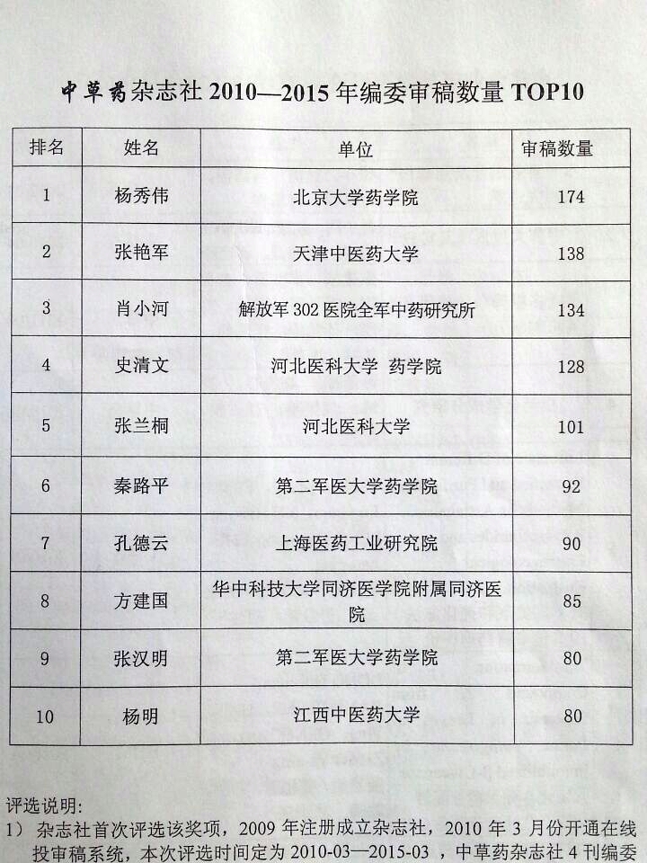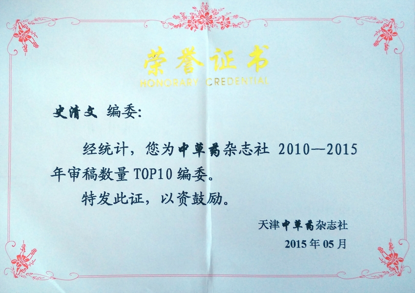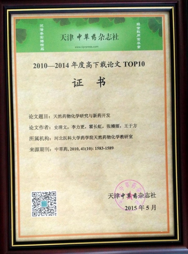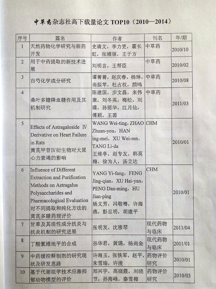 我室发表的论文再获殊荣:被评为“天津中草药杂志社2010—2014年高下载TOP10优秀论文”