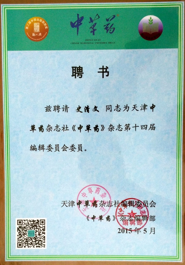 我室史清文教授再次受聘为《中草药》编委